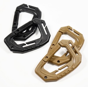 ブランドロゴ刻印が⼊ったカラビナをベースに構成されたカラビナの2個セットとなります。本体のカラビナの成分としてPOM(ポリアセタール樹脂)を使⽤しており、ABS樹脂に⽐べ粘りがあり衝撃に強く耐候性(紫外線劣化等)にも強い特性があります。