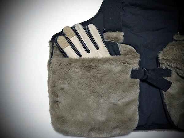 グリズリージャケット(熊ジャン)をイメージ(コーディネート)ソースに考案したハンティングファーベスト。 冬のアウターの上から羽織れるサイズ設定。ショルダーバッグ代わりにも◎