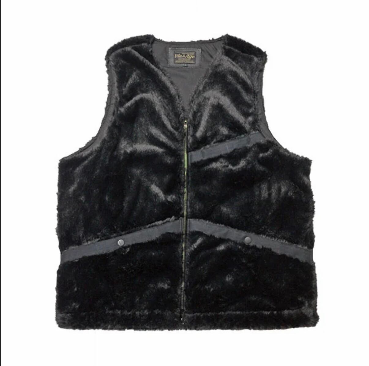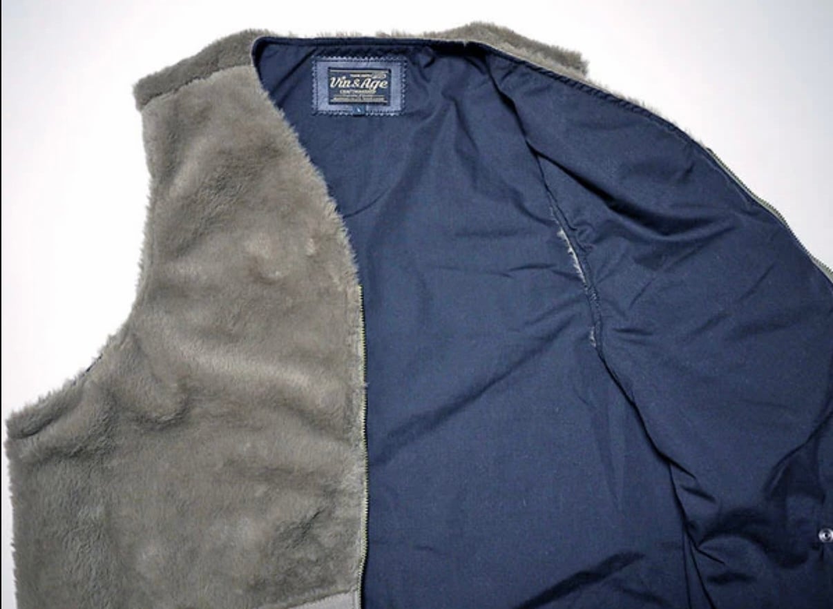 古着のエスキモージャケットをVin&Age的にアレンジしたファーベスト。 ’70モノによくみるチロリアンテープをコットンテープ替え、背中のクロスデザイン等で バイカーテイストにまとめました。 冬のアウターの上から羽織れるサイズ設定。