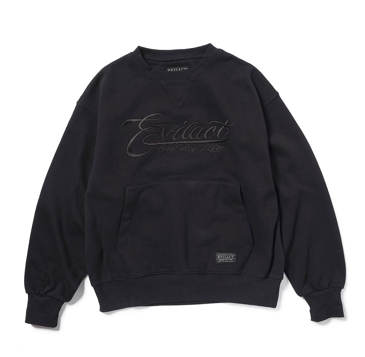 クルーネックには珍しいカンガルーポケットも搭載しフロントにEVILACT LOGOが贅沢に 同色刺繍。