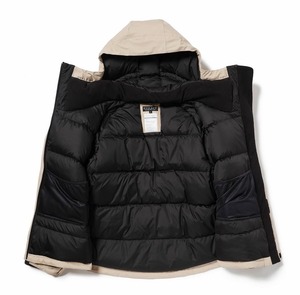 外側はシンプルなアウターを意識したデザインにながらも、内側とフード調整部、インナーポケット等、複雑なパターンで構築している。