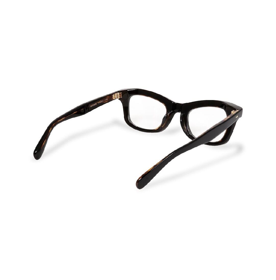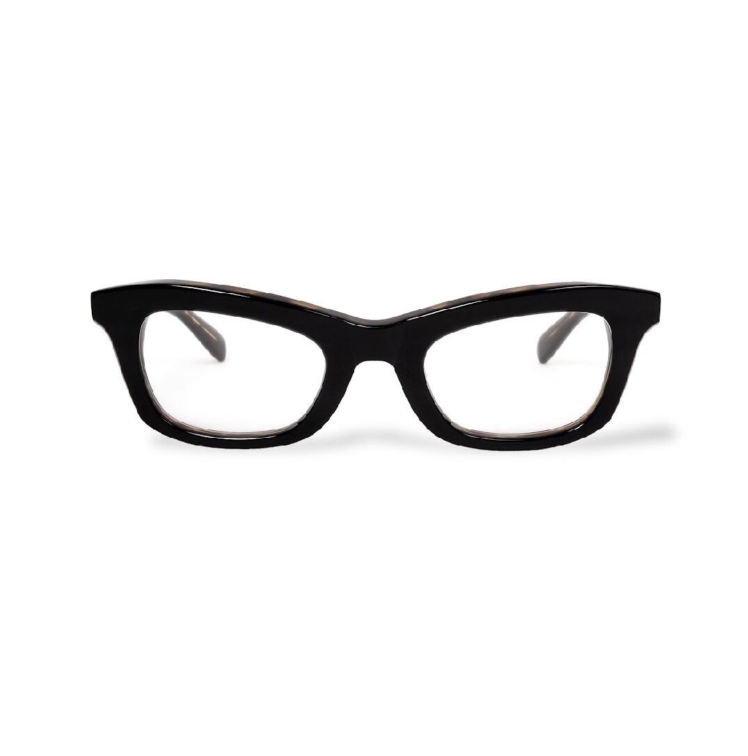 吊り上がったブローライン。アンダーはウェリントン的な落ち着きある形状を持ったボリューミーで個性的なデザインが特徴。