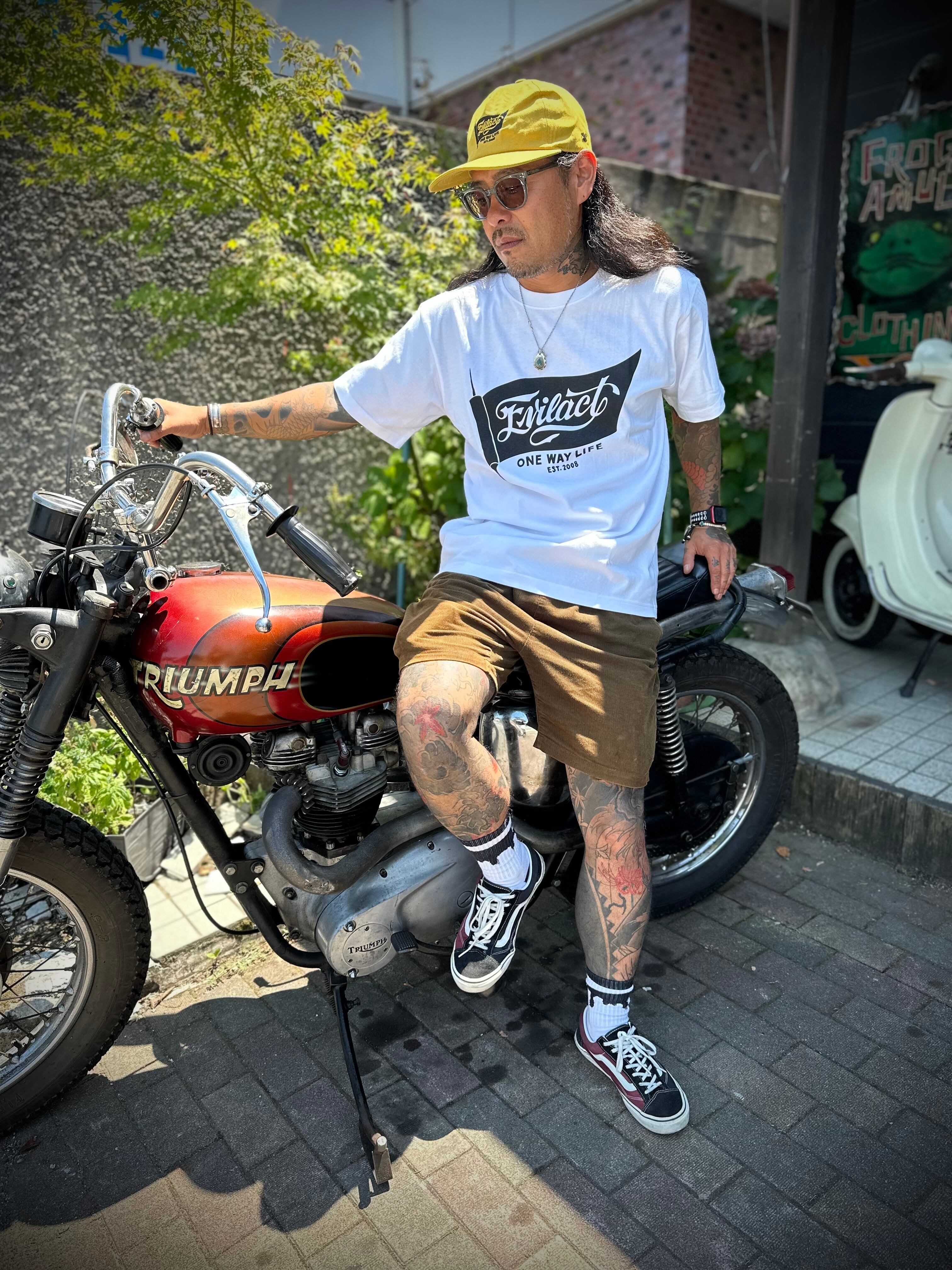 EVILACTのアイコンでもあるFLAGグラフィックが全面にプリントされれた半袖クルーネックTシャツ。