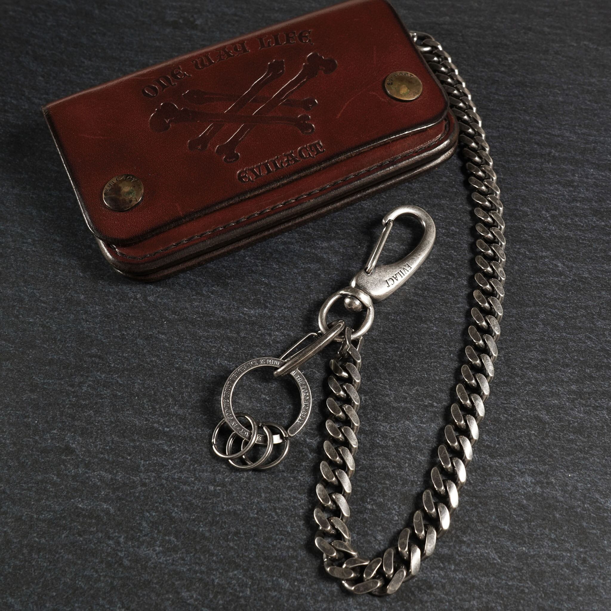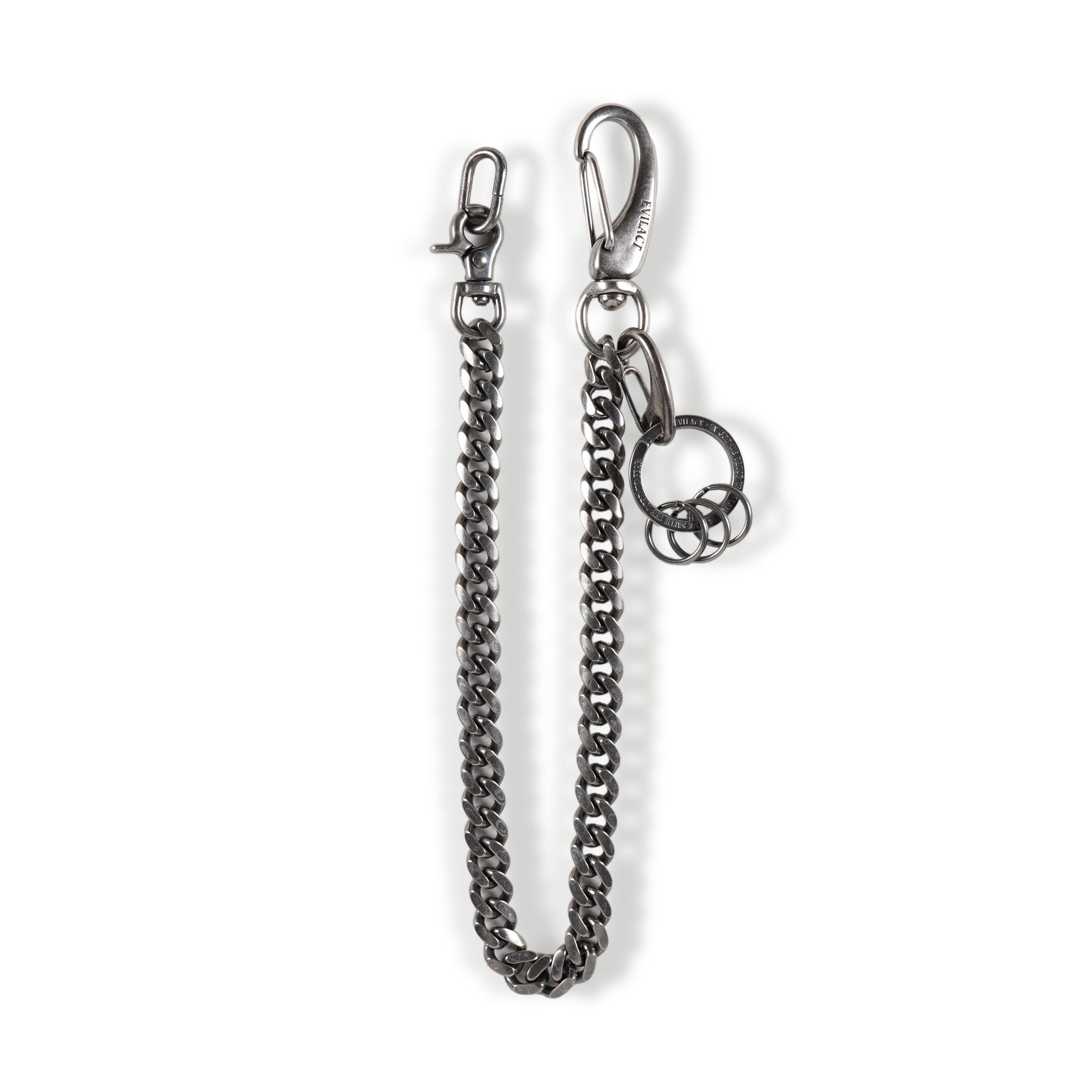 アクセサリープランド「39 (サンク)」に制作を依頼したオリジナルウォレットチェーン。真鍮ベースにシルバーをコーティングした、ロングタイプキーフック。