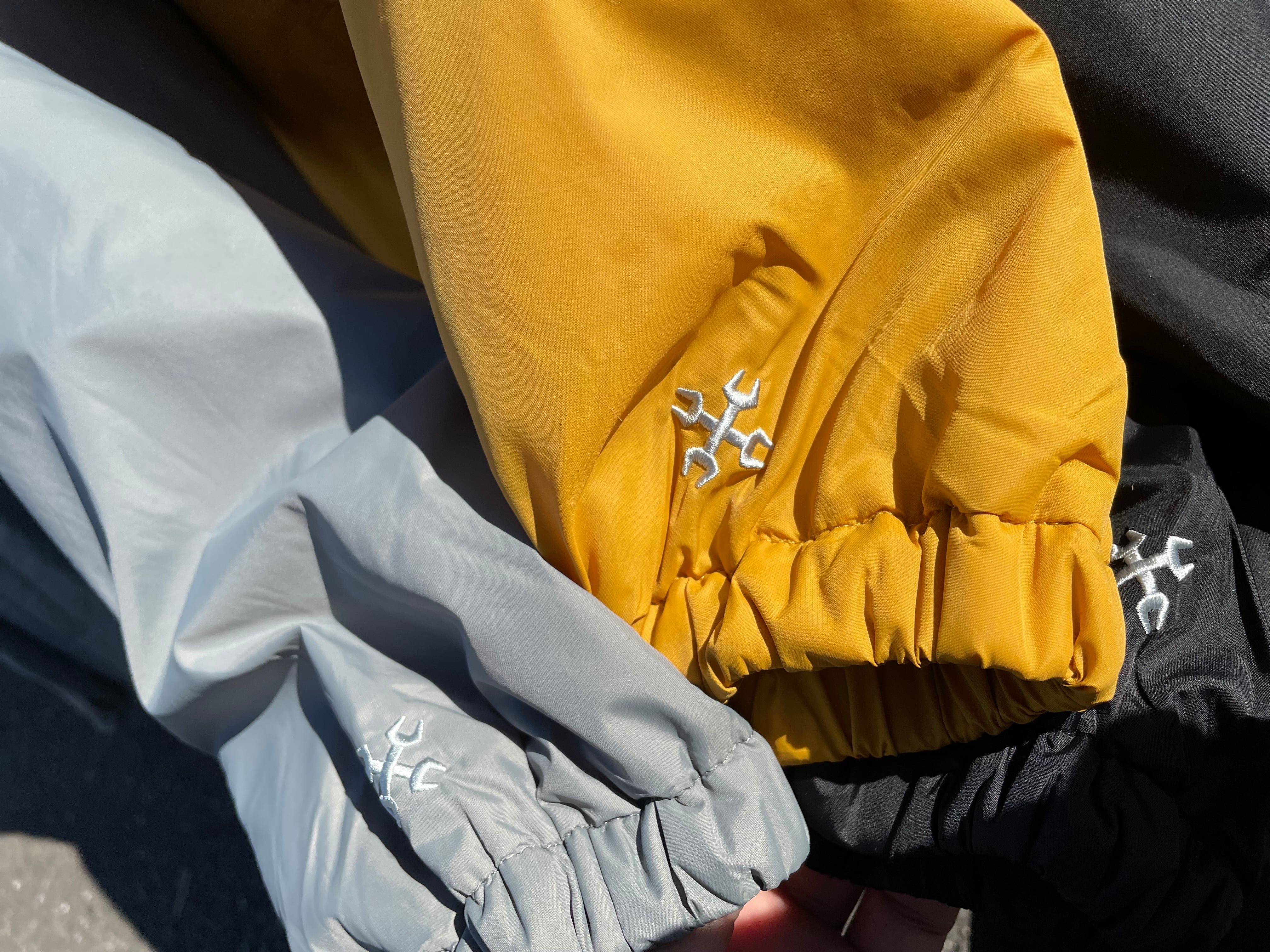 左袖口のブランドアイコンのクロススパナ刺繍、襟のスクリプトロゴ刺繍がアクセントになっています。